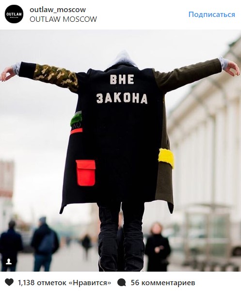 Криминальная тема вкупе с кириллицей вообще пользуется большим спросом у западных пижонов. Вероятно, этим объясняется спрос на российскую марку уличной одежды Outlaw («Вне закона»).