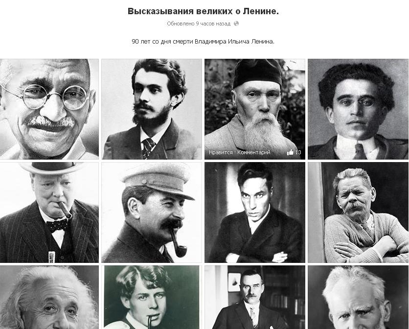 Проект «Высказывания великих о Ленине» был запущен в сообществе «Вестей» на Facebook. Программа размещала цитату и фотографию известного человека, который когда-либо высказывался о вожде революции. Помимо Бориса Пастернака, Уинстона Черчилля и Бернарда Шоу в ленте оказалась и цитата министра пропаганды Третьего Рейха Йозефа Геббельса. Позже изображение и высказывание нацистского деятеля были удалены.