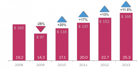 Как видно из графика, на протяжении последних трех лет зафиксировано постепенное снижение темпа роста рекламного рынка, что связано с возвращением к докризисному уровню в национальной валюте. При этом бюджеты 2013 г. (166$ млн. с НДС) даже несколько превысили показатели докризисного 2008 г. (160$ млн. с НДС).