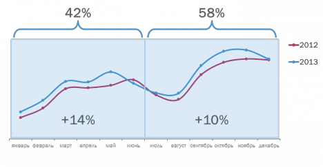 При этом основной рост телерекламного сегмента пришелся на 1-е полугодие 2013 г. - +14% к значению аналогичного периода 2012 г. Рост 2-го полугодия составил +10%, что объясняется более высокой базой 2-го полугодия 2012 г. Как известно, вторая половина 2012 г. была насыщена спортивными событиями мирового значения, а также значительным ростом рекламных бюджетов рекламодателей после затянувшегося ожидания «второй волны кризиса» первой половины 2012 г.