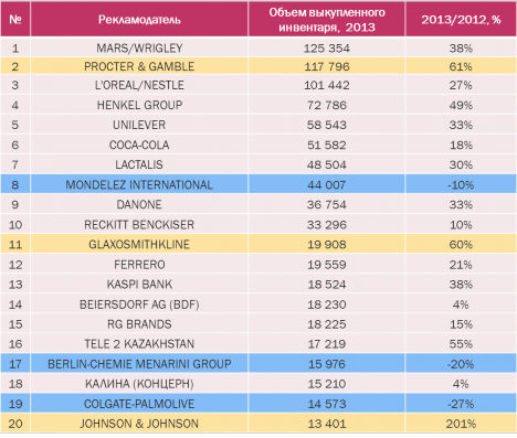 Список рекламодателей первых 15 мест является стабильным по своему составу, состоящим почти на 100% из представителей крупных международных компаний. Исключение составляют 2 рекламодателя - KASPI BANK и RG BRANDS, 13-е и 15-е места соответственно. Впервые за последние годы в TOП-15 попали казахстанские рекламодатели.