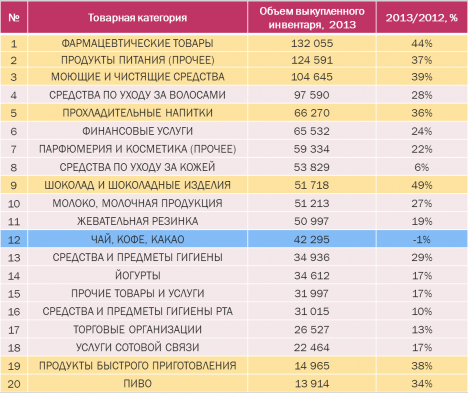 Относительно ТОП-20 товарных категорий, список 2013 г. в значительной степени повторяет список прошлого года. Как видно из таблицы практически все товарные категории увеличили объемы выкупленного инвентаря в 2013 г.