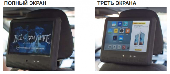 Рекламодателям будут доступны два рекламных формата - полный экран и треть экрана. При этом, второй формат предполагает настройку геотаргетинга. Например, возможно показать рекламу только пассажирам по дороге в/из аэропорта или только при поездках внутри Садового кольца. Минимальный период размещения составляет 1 неделю.