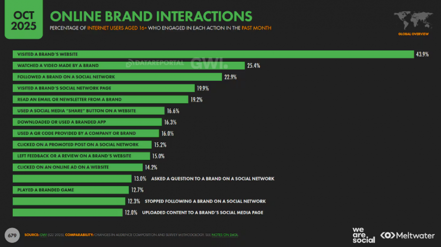 Главный инструмент вовлечения пользователей после веб-сайта бренда — его видеоролики. За месяц ролики брендов смотрели 25,4% пользователей, это больше, чем просмотры страниц, рассылок и подписок на аккаунты. Тренд усиливается тем, что взрослые почти 7 часов в неделю смотрят короткие ролики в Reels и TikTok. Снижает отдачу от рекламы некачественное видео в кампаниях.