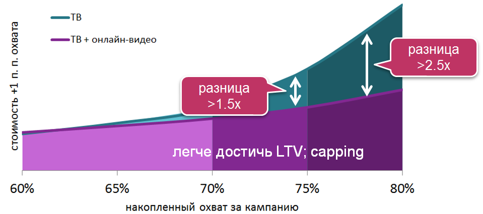 Пока ТВ охватывает практически все население (в отличие от видеорекламы с 50% охвата всего населения России) (прим.6), и средняя CPT на ТВ значительно ниже средней CPT в онлайн-видео, следовательно, набирать высокий охват с нуля быстрее и дешевле с помощью ТВ, а не с помощью онлайн-видео. Однако когда телерекламой охвачено уже около 60% целевой аудитории, рекламодателю становится выгодно размещать видеорекламу в интернете в дополнение к телевизионной.