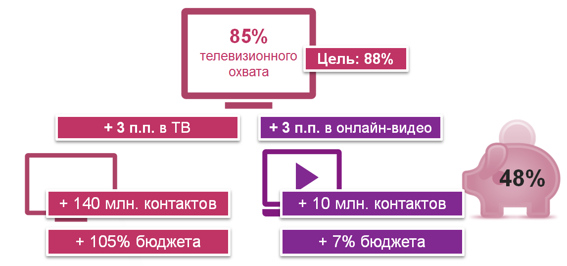 Для увеличения охвата на 3 п.п. – до 88% - с помощью телевизионной рекламы необходимо было бы потратить дополнительно 140 млн. контактов, т.е. увеличить первоначальный бюджет на 105%. А для добора охвата с помощью рекламы в онлайн-видео потребуется всего 10 млн. контактов (т.е. всего +7% бюджета дополнительно). Таким образом, при охвате 88% целевой аудитории силами и ТВ, и онлайн-видео, рекламодатель потратит почти вдвое меньше денег, чем если бы прибегал только к помощи телевизионной рекламы.