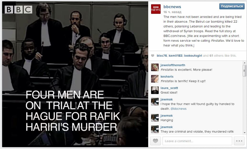 Британская корпорация BBC экспериментирует с форматом коротких новостей в Instagram. Проект под условным названием Instafax подразумевает короткие видеосюжеты, из которых аудитория оперативно узнает наиболее важные факты, а при желании продолжит просмотр на сайте BBC.