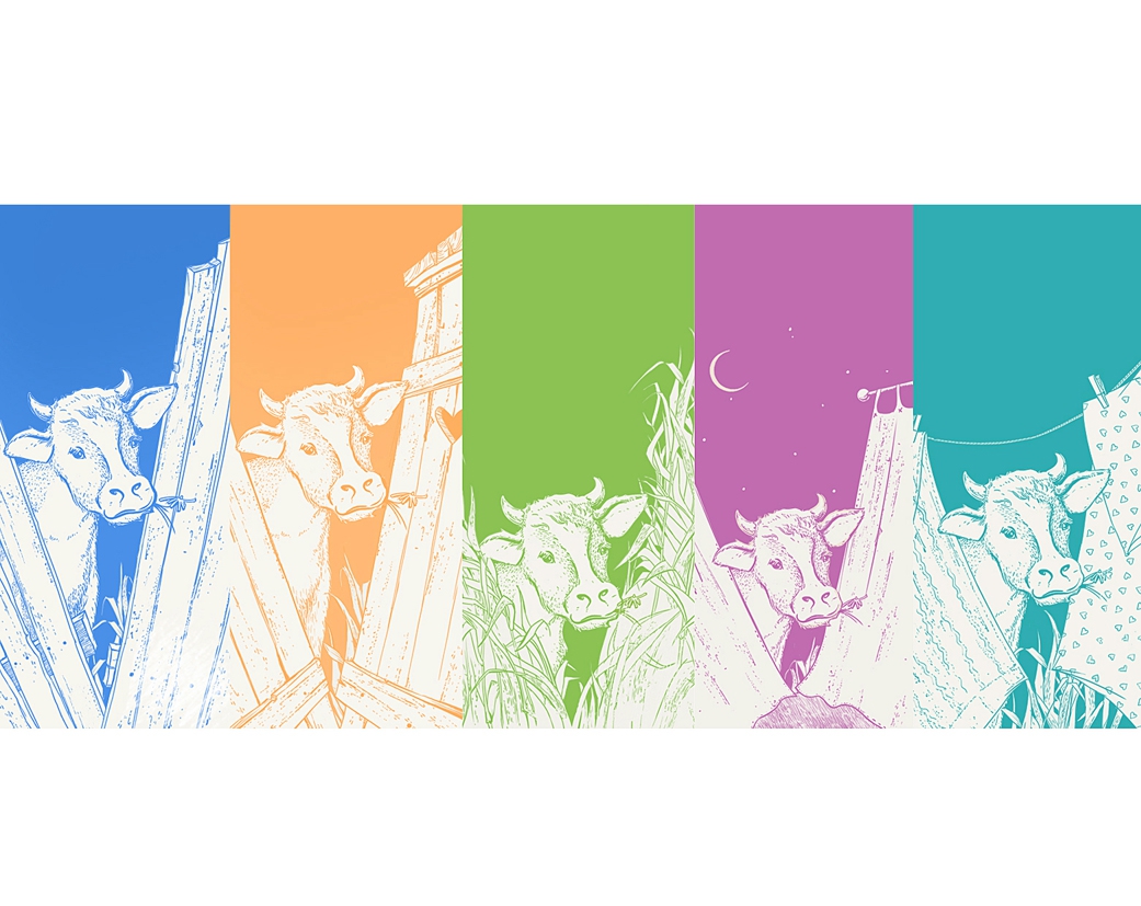 На упаковке молока буренка выглядывает из-за забора, на сливках - из-за занавески, на сметане - среди развешанного на веревке белья, а на простокваше появляется среди зарослей травы. Таким образом авторы хотят донести до потребителя мысль о натуральности продукта, которое нашло отражение в изображении деревни.
