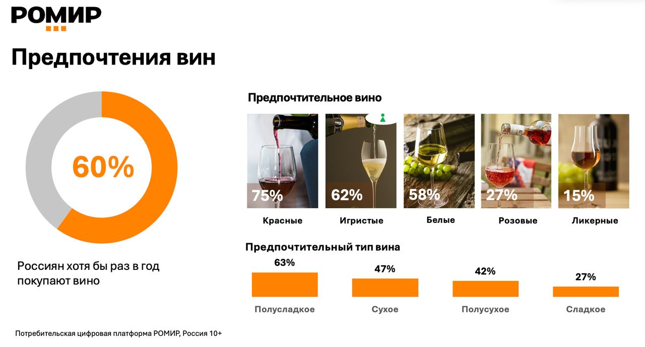 75% россиян предпочитают красные вина, 62% — игристые, 58% — белые. 27% выбирают розовые вина, 15% — ликёрные.