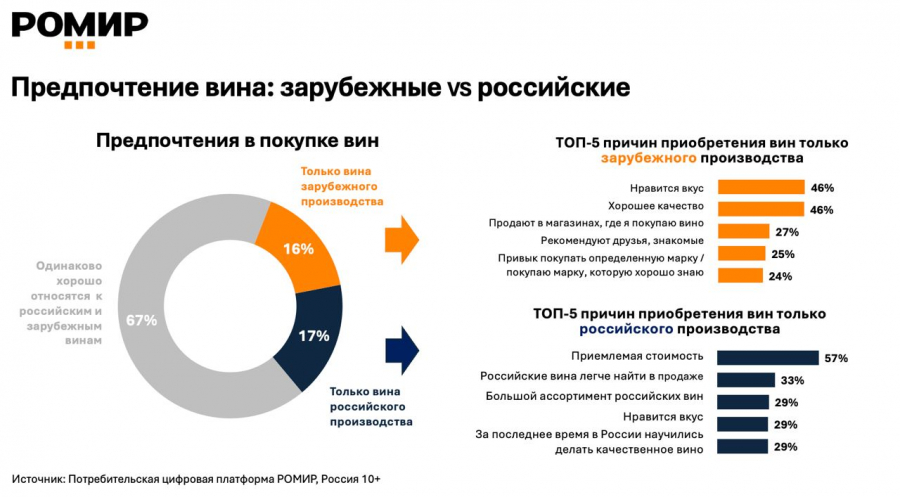 У россиян растёт интерес к отечественным винам. 67% опрошенных готовы рассматривать российские вина для покупки наравне с импортными, 17% приобретают отечественные вина. В числе плюсов такой продукции респонденты называют приемлемую цену (такое мнение высказали 57% опрошенных), наличие в продаже (33%), большой ассортимент, вкус и растущее качество (по 29%). Таковы данные исследования «Ромир», которое есть в распоряжении Sostav.
