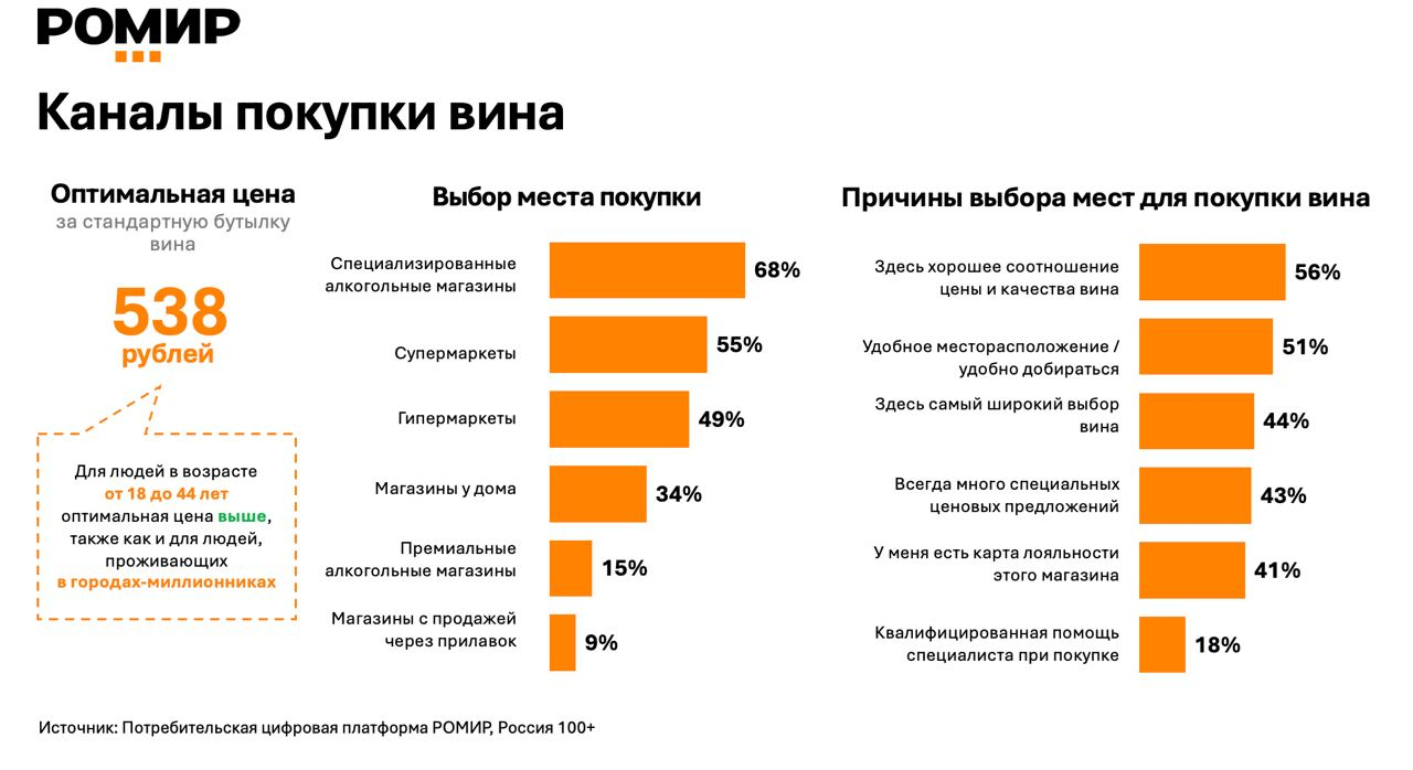 68% респондентов приобретают вина в специализированных алкогольных магазинах, 54% — в супермаркетах, 48% — в гипермаркетах. В числе других мест для покупки напитка — магазины у дома (33%), премиальные алкогольные магазины (14%), торговые точки с продажей через прилавок (9%). Оптимальна цена за бутылку — 538 руб.