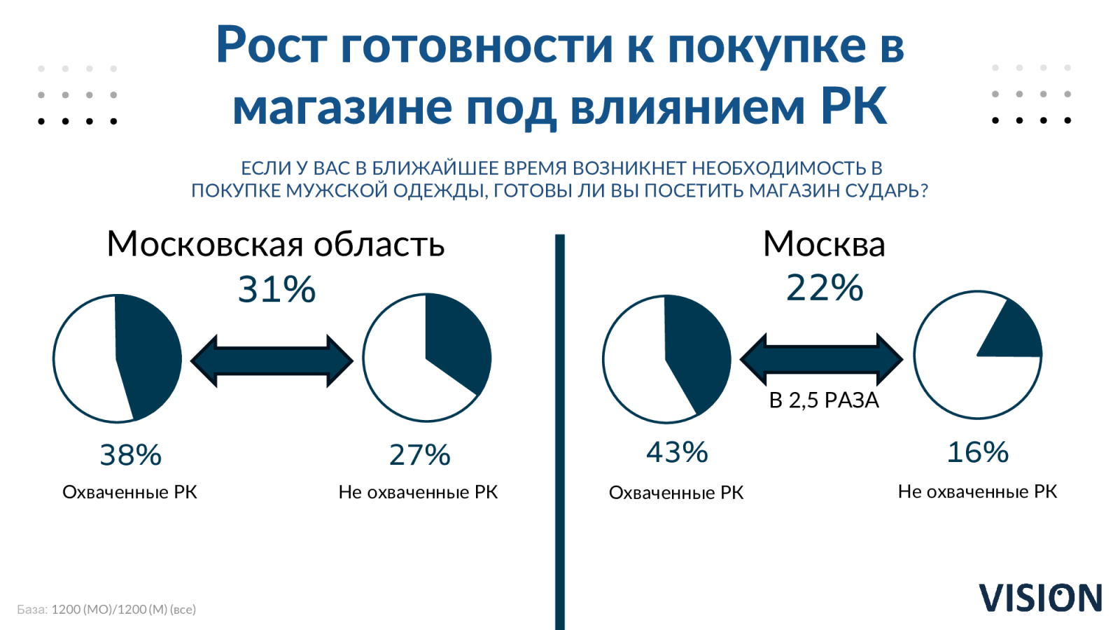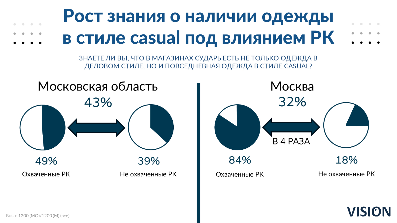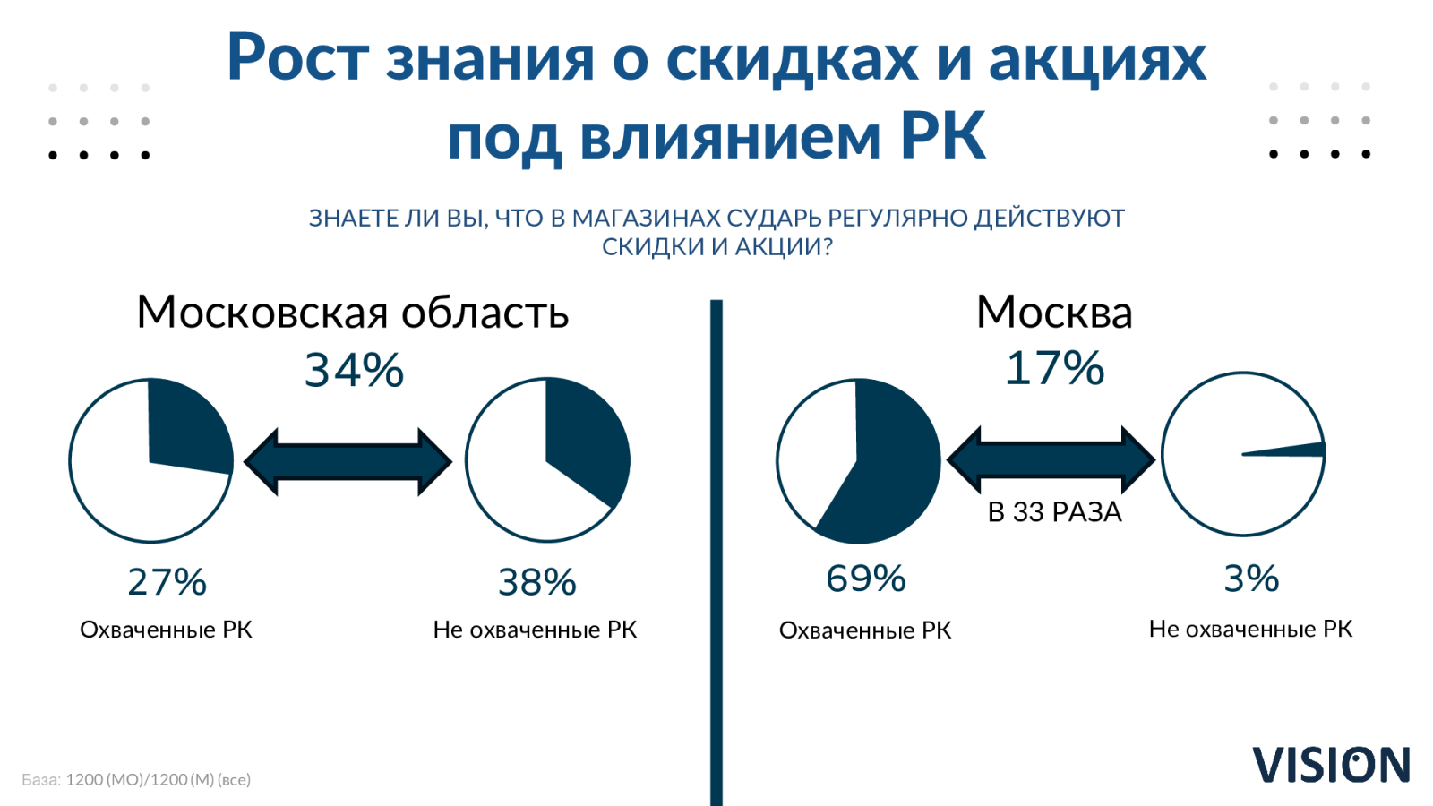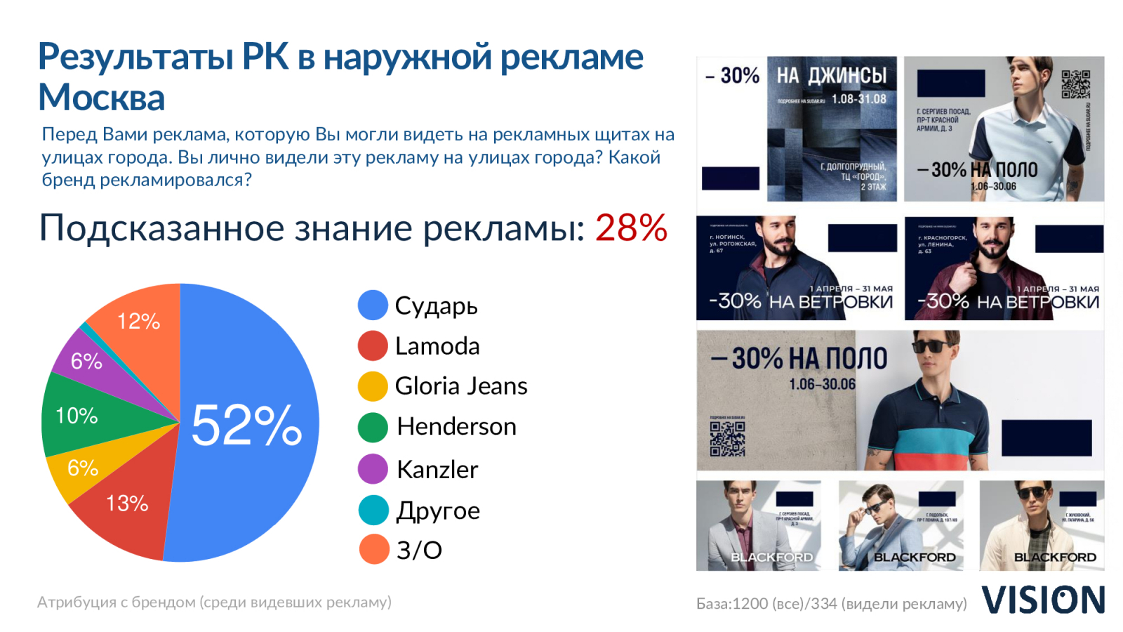 Таким образом, реализовав рекламную кампанию только в городах Московской области, «Сударь» получил дополнительный охват как минимум 28% жителей Москвы. Представители VinEx Media подчёркивают, что это ещё раз доказало, как наружная реклама в Московской области работает и на москвичей в том числе. В выборке участвовали 1,2 тыс. москвичей и 1,2 тыс. жителей Подмосковья.