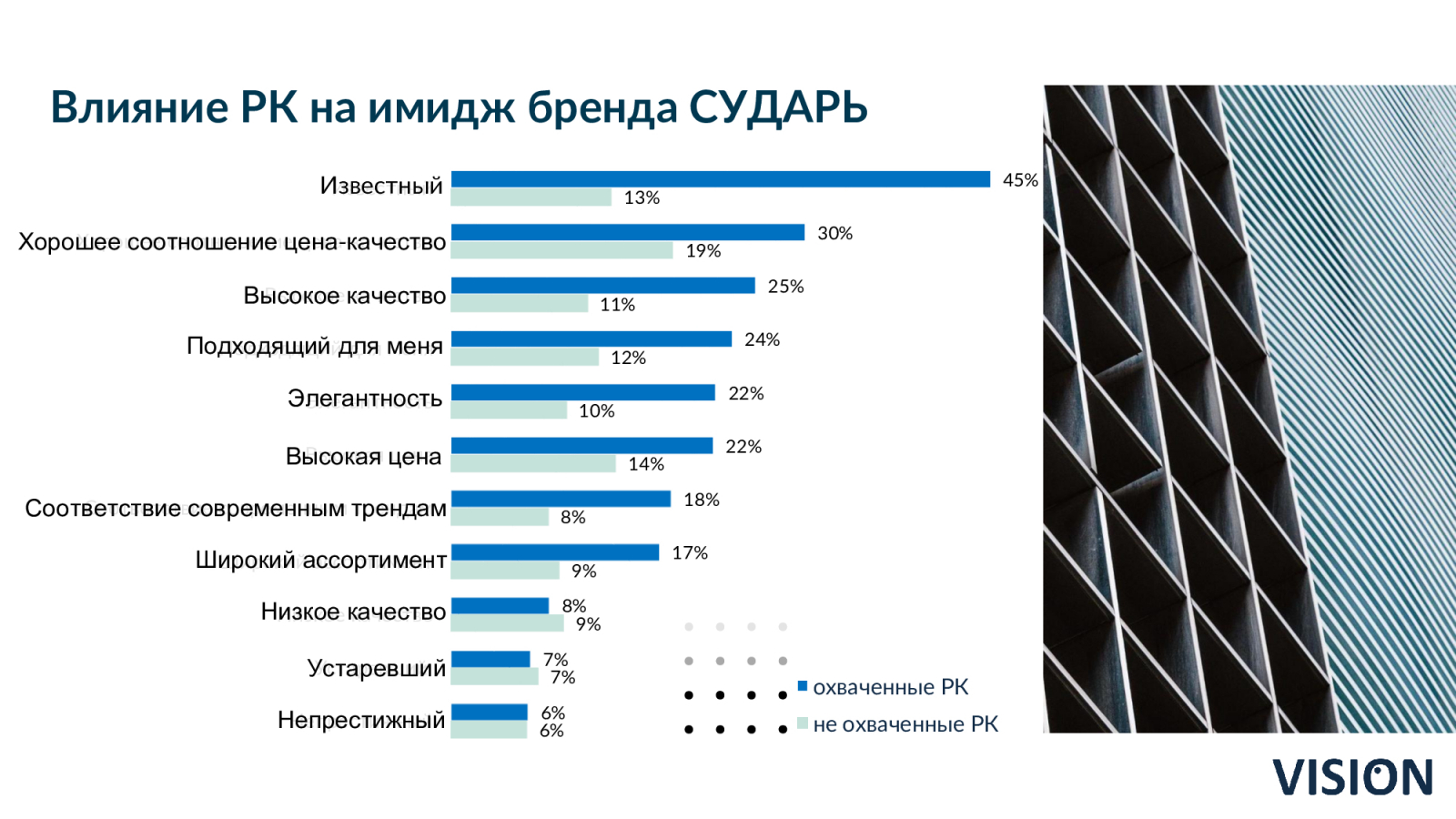 По данным исследования, 28% респондентов видели рекламу бренда «Сударь» на щитах наружной рекламы, а 52% правильно запомнили название бренда. Рост спонтанного знания бренда под влиянием рекламной кампании вырос в два раза, а рост знания о скидках и акциях, которые анонсировались на участвующих в размещении рекламных макетах, — в 33 раза. Готовность к покупке в магазинах «Сударь» среди респондентов, проживающих в Москве, увеличилась в 2,5 раза.