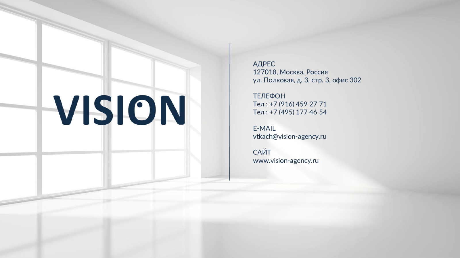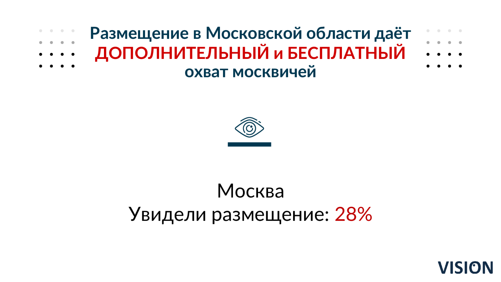 Сеть VinEx Media сегодня охватывает более 60 крупнейших городов Московской области и позволяет полностью охватить жителей региона. Мы очень рады, что исследование Vision подтвердило нашу гипотезу о том, что наружная реклама, размещённая только в Московской области, охватывает дополнительно в том числе и значительную часть жителей Москвы. А учитывая, что стоимость рекламного контакта в Подмосковье более чем в два раза ниже, чем в столице, это даёт существенную экономию рекламных бюджетов.