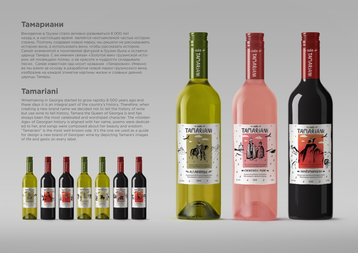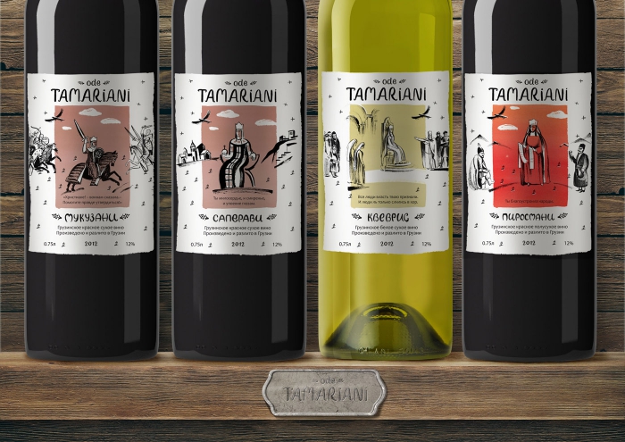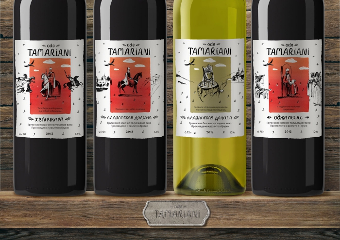 Самой знаменитой и почитаемой фигурой в Грузии была и остается царица Тамара. С ее именем связан «Золотой век» грузинской истории, ей посвящали поэмы, о ее красоте и мудрости складывали песни. Самая известная ода носит название «Тамариани». Именно ее авторы проекта взяли за основу в разработке новой марки грузинского вина, изобразив на каждой этикетке картины жизни и славных деяний царицы Тамары.
