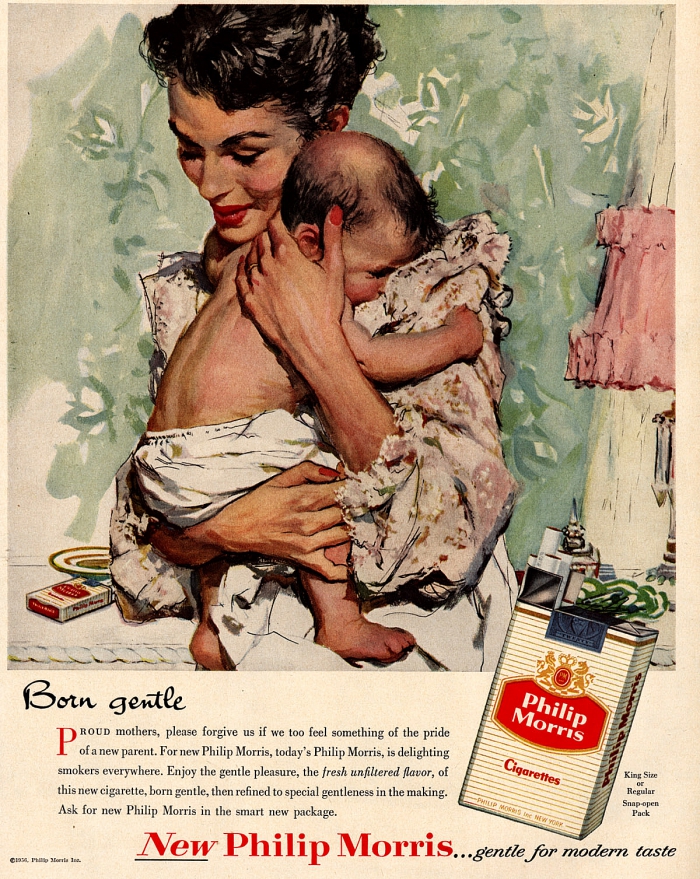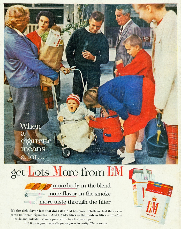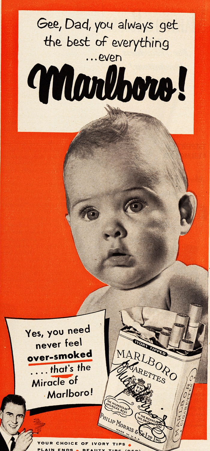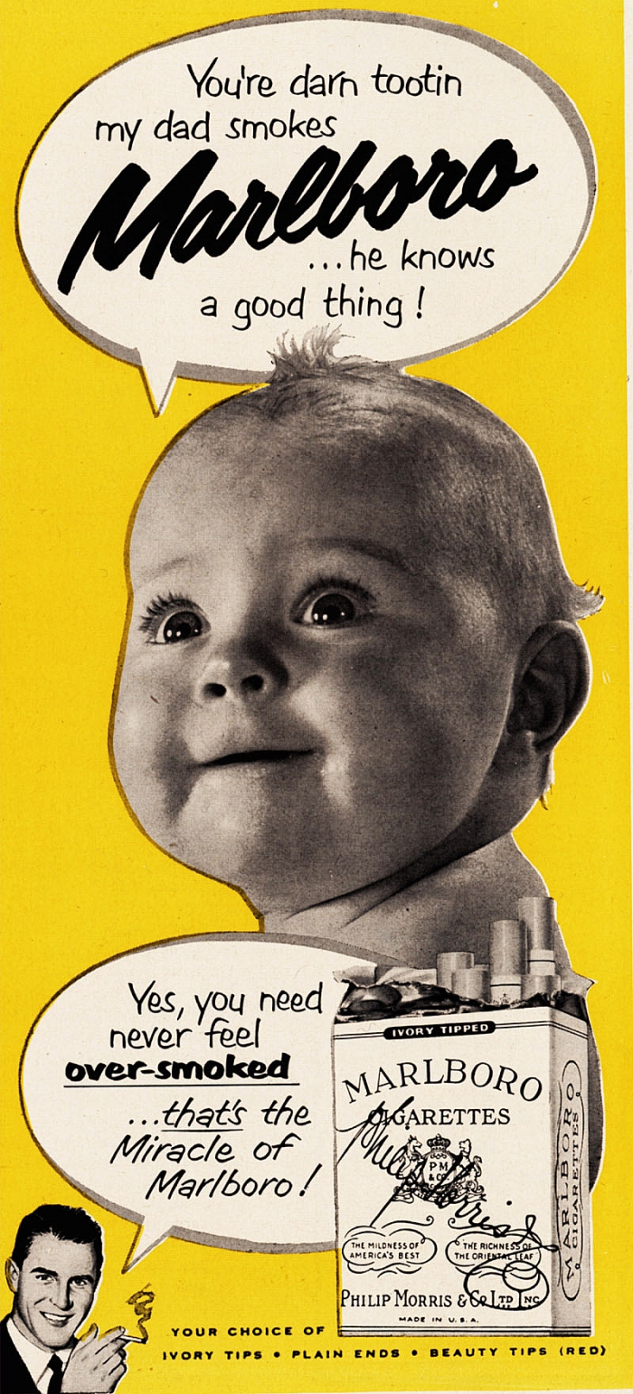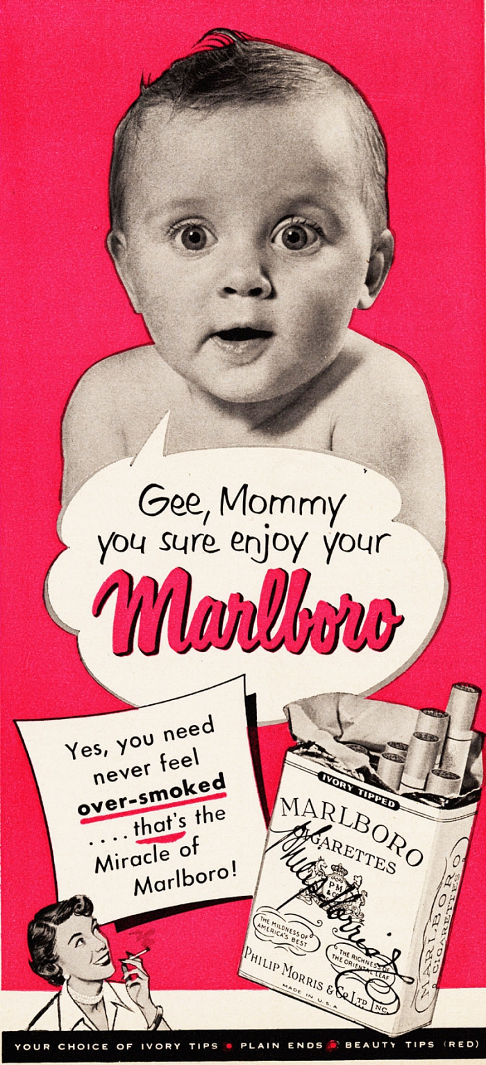 Вплоть до середины 60-х производители сигарет в своей рекламе акцентировали внимание на качестве своей продукции и её полезных свойствах. Так, табачные бренды Marlboro, Camel, L&M и другие помещали на рекламные принты своей продукции детей с курящими мамами или в кругу курящей семьи.