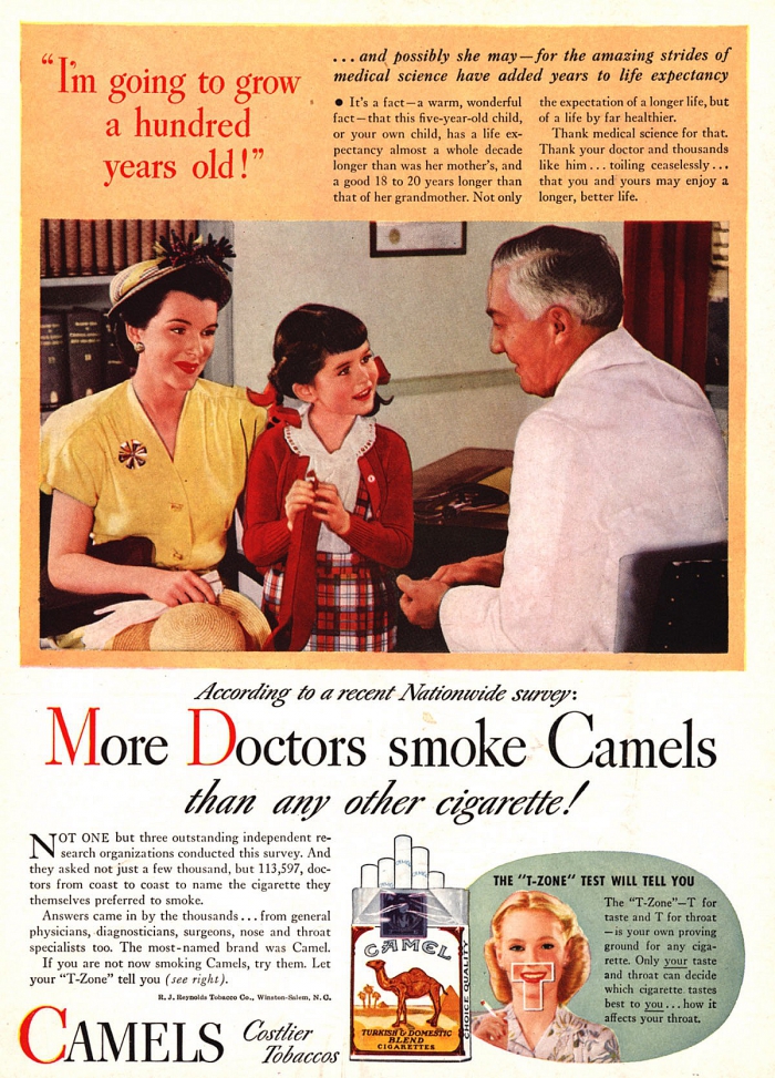В 1940-х табачный бренд Camel запустил рекламную кампанию, которую трудно представить в наши дни. Рекламщики решили сыграть на доверии потребителей к врачам и разместили на рекламном принте курящего доктора: "Врачей, которые курят Camel больше, чем тех, кто курит другие сигареты".