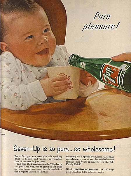 В 1950 годах бренд газировки 7-Up позиционировался как напиток для всей семьи без исключения - даже для младенцев. Рекламщики предложили мамам в равных пропорциях разбавлять молоко газировкой, так дети будут охотнее его пить.