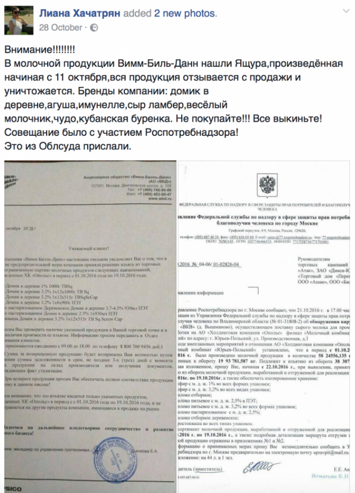 26–27 октября появился информационный вброс о якобы проведенном совещании, на котором было оповещено, что Роскомнадзор нашел ящур в молочной продукции компании. 26 октября, с 12:00 по 15:14, были зафиксированы первые активные вбросы во «ВКонтакте» и Facebook.