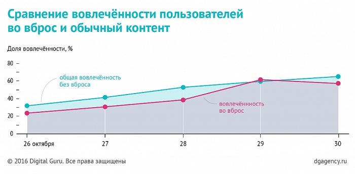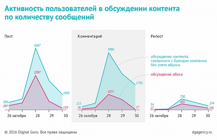 Общая вовлеченность же (отношение суммы репостов и комментариев к общему количеству публикаций) в первые дни активных посевов оказывается даже ниже средней вовлеченности без учета вброса.