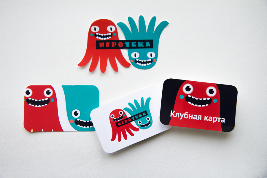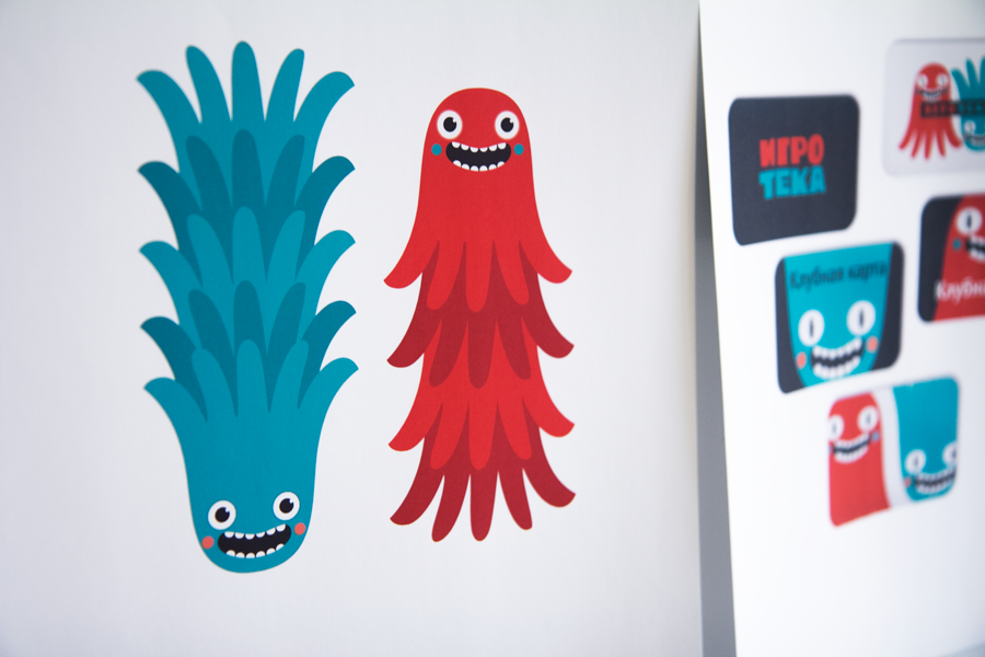 Герои-монстры из логотипа стали лицом игротеки. В фирменном стиле они развиваются, материализуются в фирменных персонажей и присутствуют на площадках — в интерьере, навигации, клубных картах и на любых фирменных носителях, могут участвовать в промомероприятиях — онлайн и офлайн.