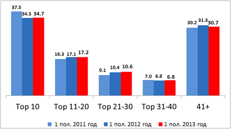 В 1-м полугодии 2013 г. впервые за последние несколько лет доли по объему бюджетов в каждой из пяти групп остались на уровне прошлого года. Это говорит о том, что динамика каждой группы была сопоставима со среднерыночной, что свидетельствует о стабильности на рекламном рынке.