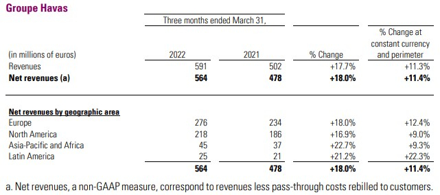 Компания Vivendi, которой принадлежит Havas Group, опубликовала финансовый отчёт по итогам первого квартала 2022 года. Выручка коммуникационного холдинга Havas составила €591 млн, что на 17,7% больше, чем в первом квартале 2021 года.