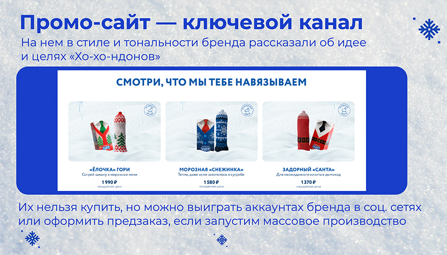После того как мы произвели лимитированный выпуск «Хо-хо-ндонов», подготовили промосайт — ключевой коммуникационный хаб. На нем в стиле и тональности бренда рассказали об идее и целях «Хо-хо-ндонов».