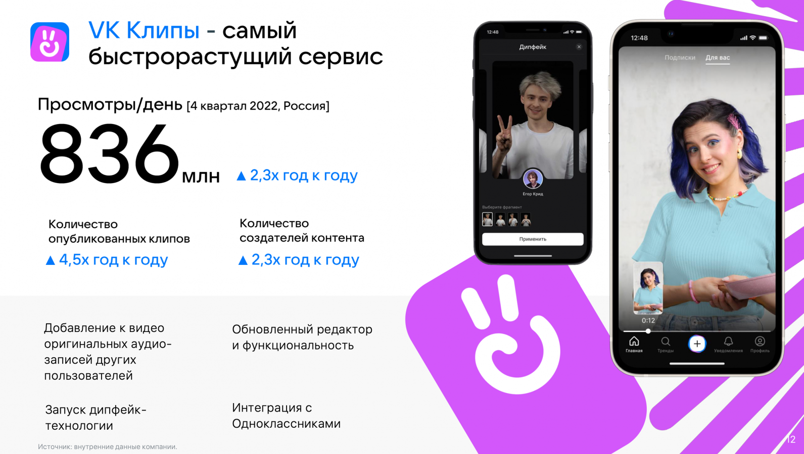 Ежедневные просмотры «Клипов» в четвёртом квартале выросли на 127% год к году до 836 млн. Количество опубликованных клипов увеличилось за аналогичный период на 346%, а число создателей контента выросло на 133%.