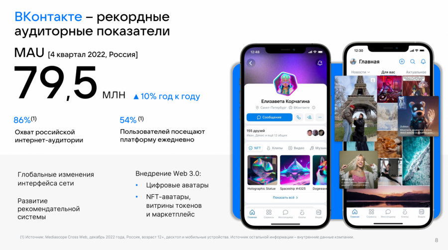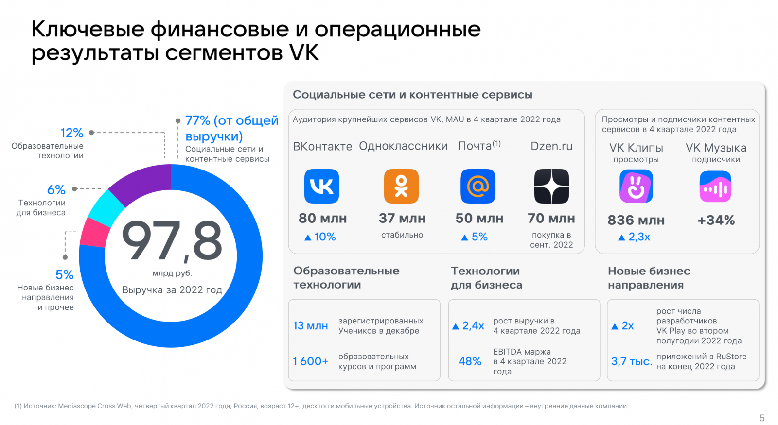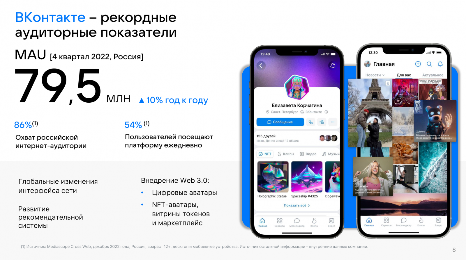 В четвёртом квартале 2022 года средняя месячная аудитория (MAU) крупнейшего актива компании «ВКонтакте» в России выросла на 9,6% год к году до рекордных 79,5 млн пользователей. Средняя дневная аудитория (DAU) выросла на 8,9% год к году до также рекордных 51,1 млн пользователей. Рост аудитории и её вовлеченности привёл к росту выручки соцсети на 29% в 2022 году и на 31% в четвёртом квартале 2022 года, говорится в отчёте.
