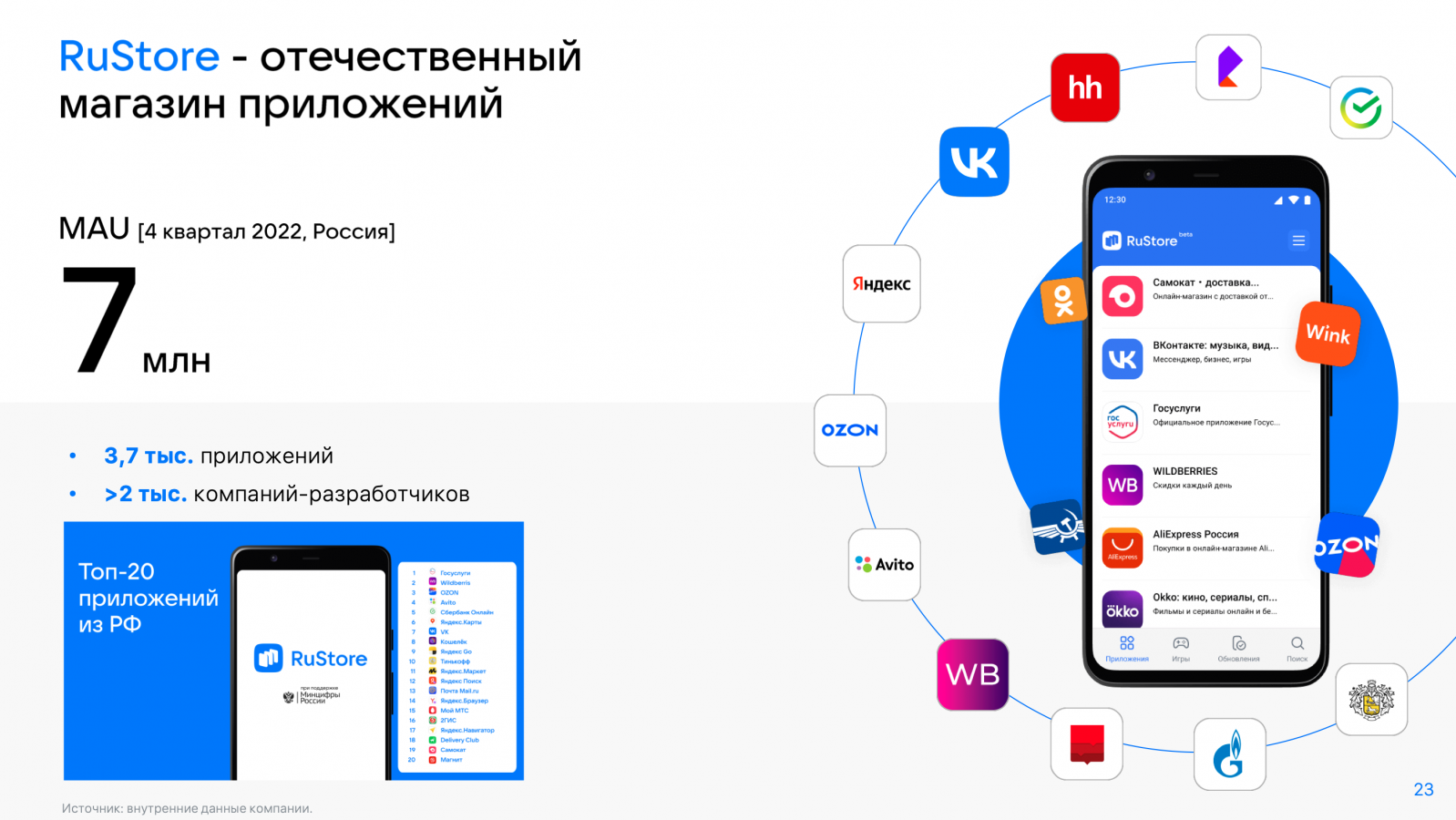 Аудитория RuStore в четвёртом квартале выросла до 7 млн человек. К концу 2022 года в магазине приложений разместили около 3,7 тыс. приложений и зарегистрировались 2 тыс. компаний-разработчиков.