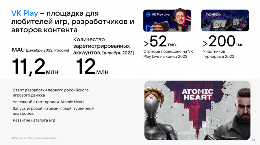 По итогам 2022 году на стриминговой платформе VK Play Live, запущенной в августе 2022 года на VK Play, провели 52 тыс. трансляций и зарегистрировались 12 тыс. стримеров.