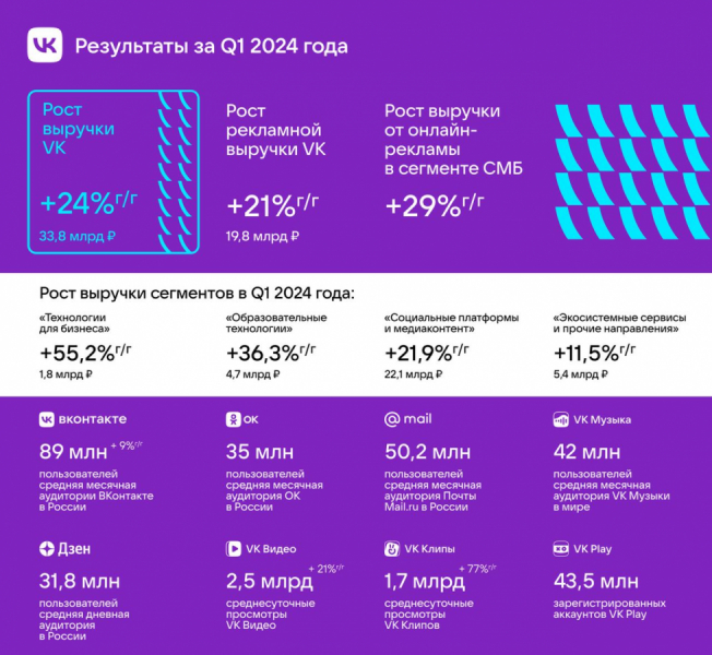 Выручка VK в первом квартале 2024-го выросла на 24% год к году и составила 33,8 млрд руб. Основным источником роста стал доход от онлайн-рекламы, который увеличился на 21% год к году — до 19,8 млрд руб. Доходы от онлайн-рекламы среднего и малого бизнеса (СМБ) выросли на 29%. Об этом говорится в отчёте компании.