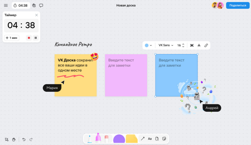 «В «VK Доске» пользователям доступно виртуальное интерактивное пространство, где они могут создавать масштабируемые умные доски со стикерами, фигурами, добавлять текст, изображения, ссылки и другие элементы, а также устанавливать таймер для продуктивной работы в строго отведенное время», — рассказали в пресс-службе VK.