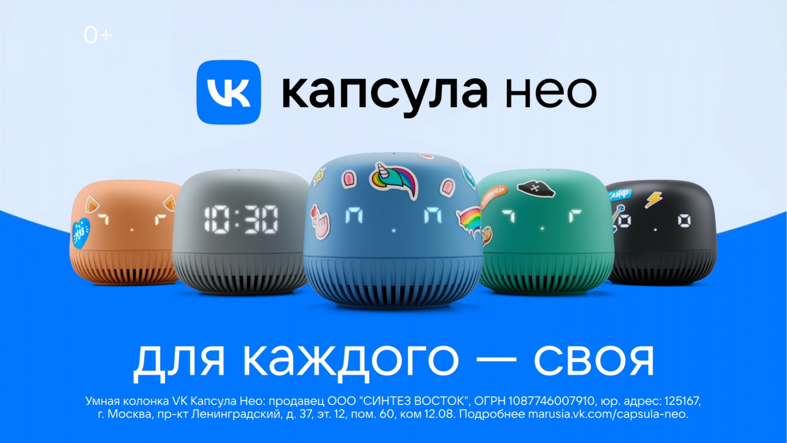 В рекламном ролике команда проекта обыграла название новой модели, продемонстрировала её характеристики и показала фичи, которые будут полезны всей семье. Благодаря стикерам соцсети «ВКонтакте» «VK Капсула Нео» получила возможность кастомизации через разные стикерпаки с пятью героями. Пользователи смогут передать колонке характер одного из своих любимчиков — свободолюбивого кота Персика, остроумного пса Дигги, дружелюбного хомячка Сени, мечтательного единорога Спаркса и жизнерадостного Спотти. С их помощью можно сделать «VK Капсулу Нео» по-настоящему оригинальной, отмечает команда VK. Эту идею дополнил слоган кампании — «Для каждого — своя».
