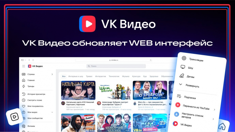 На vkvideo.ru обновили навигацию сайта, добавили новые функции, перенесли подписки на авторов из сторонних сервисов. В разделе «Подписки» появился доступ к списку авторов и возможность скрывать тех, чей видеоконтент не актуален в ленте.
