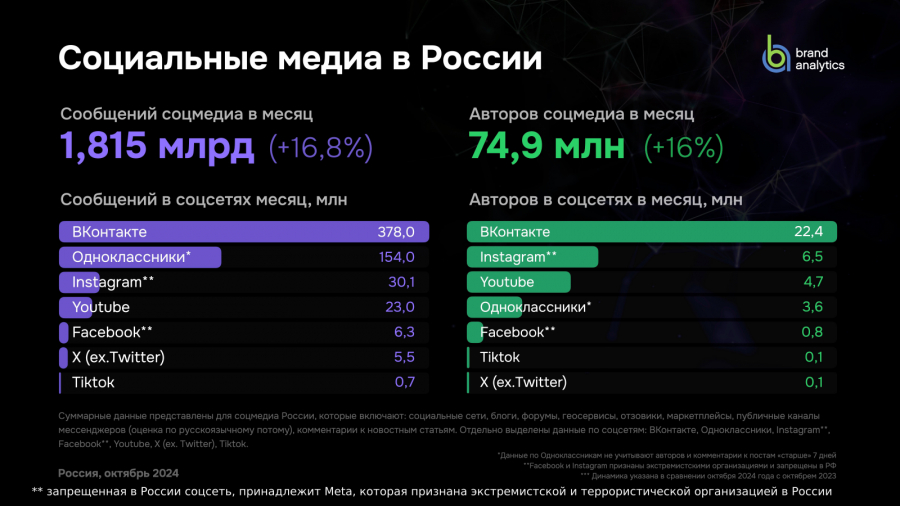 В октябре российские пользователи опубликовали в соцсетях 1,815 млрд публичных записей, из которых 378 млн были размещены во «ВКонтакте».