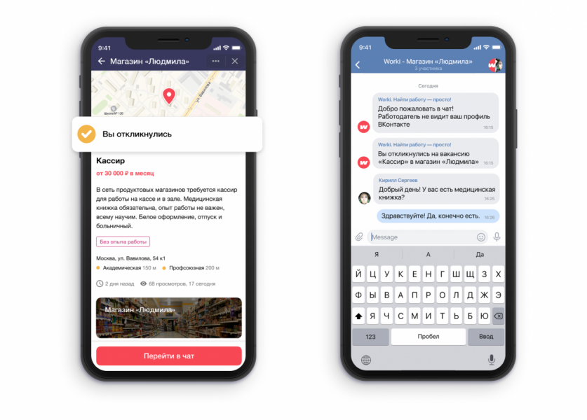 Теперь прямо в VK пользователи могут общаться с представителями компаний. Для этого соискателю нужно отправить резюме и дождаться от работодателя положительного ответа. Начать общение может и наниматель, если заинтересуется каким-либо резюме из базы. Для кандидата собеседование в VK будет выглядеть как диалог, в котором работодатель общается от имени мини-приложения Worki. Для каждого ответившего нанимателя создаётся отдельная беседа, а компания указывается в названии чата — так не возникнет путаницы.