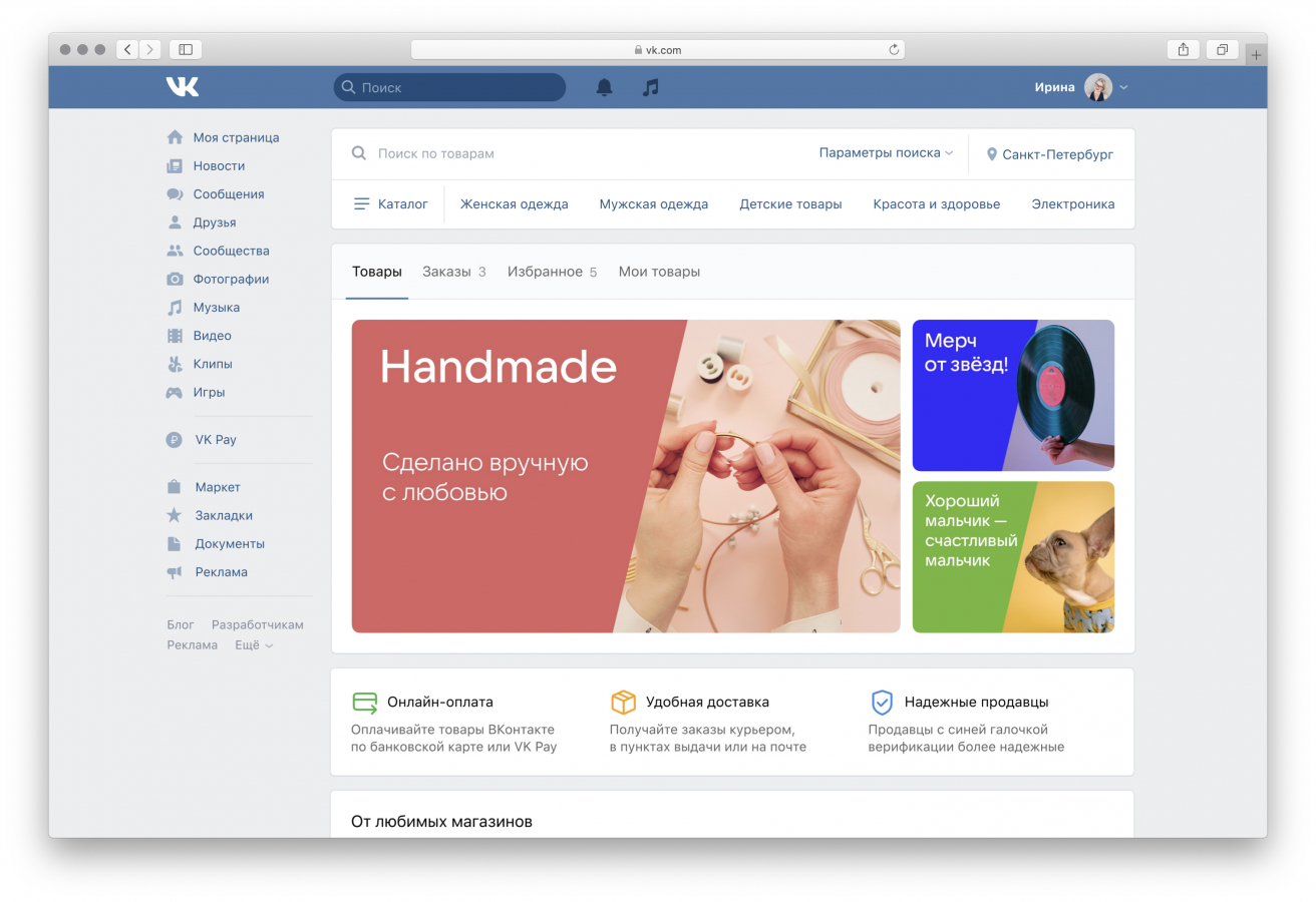 Маркетплейс оснащен разделом поиск, в нем есть тематические категории и персональные подборки. За рекомендации отвечает специальный алгоритм, который учитывает город, возраст и увлечения пользователя, а также сезон, в который совершается покупка. Оплату можно производить с помощью банковской карты или через VK Pay.