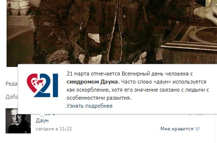 Ежедневно десятки тысяч пользователей интернета употребляют слово «даун» с целью оскорбить собеседника. Двадцать первого марта все пользователи «ВКонтакте» смогут узнать, что на самом деле оно означает. После его публикации на сайте vk.com в некорректном значении на экране пользователя будет всплывать информация о правильном употреблении слова «даун» и ссылка на страницу фонда «Даунсайд Ап» в соцсети (механика работает только на десктопе).