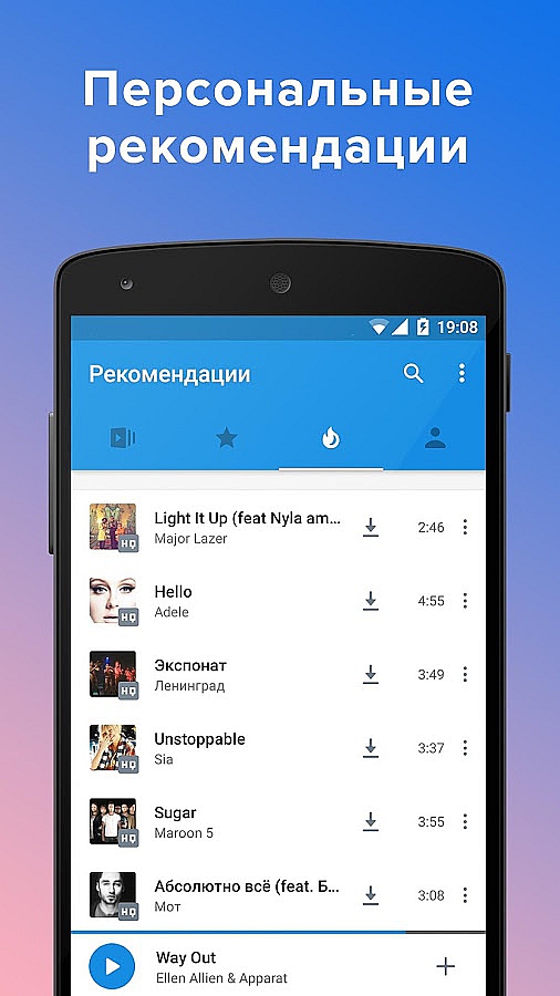 Mail.Ru Group разработала мобильное приложение Moosic. Оно позволяет не только слушать музыку из «ВКонтакте» и других социальных сетей, но и загружать песни на телефоны и планшеты. Правда, интеграция идет исключительно с «ВКонтакте». Треки можно слушать оффлайн, но прослушивание загруженного контента доступно только через приложение Moosic.