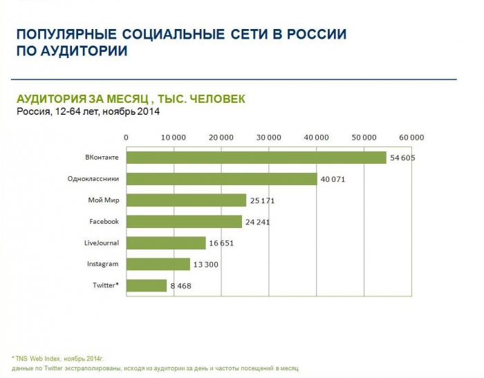 Наиболее популярными социальными сетями в России по аудитории (данные за ноябрь 2014 года среди пользователей 12-64 лет) стали ВКонтакте, Одноклассники, Мой Мир, Facebook, LiveJournal, Instagram и Twitter. Причём количество посетителей ресурсов разнится более чем в 6 раз. Бесспорный лидер – ВКонтакте с аудиторией почти 55 миллионов за месяц, замыкает топ-7 Twitter – около 8,5 миллионов пользователей. Ближайшими друг к другу конкурентами оказались Мой Мир и Facebook c аудиторией примерно 25 и 24 миллиона человек соответственно. Вторую строчку занял значительно обогнавший их ресурс Одноклассники - 40 миллионов посетителей за месяц.