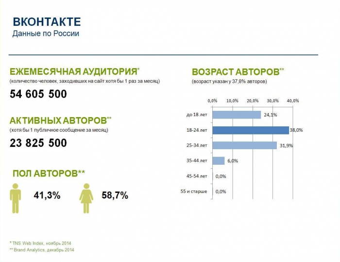 Аналитический центр Brand Analytics провёл исследование в области социальных медиа по итогам 2014 года «Социальные сети в России сегодня: цифры, тренды, прогнозы». Самой популярной соцсетью с наиболее активными авторами и наибольшей ежемесячной аудиторией оказалась ВКонтакте.