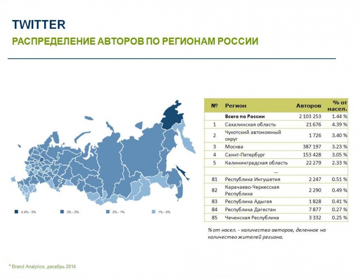 Авторами постов в Twitter, Instagram и Facebook чаще всего бывают жители Москвы и Санкт-Петербурга (причём последних в разы меньше). Вместе с тем две столицы не являются лидерами твиттера по проценту авторства от населения региона. Так, наибольшая его концентрация относится к Сахалинской области (около 4,4% от населения) и Чукотскому автономному округу (3,4%). Петербуржцы являются более активными пользователи ВКонтакте, нежели москвичи – 40% жителей северной столицы делают посты в соцсети (в Москве – 29%). В целом по России больше всего делают публикации во ВКонтаке (чуть больше 16% от населения страны).