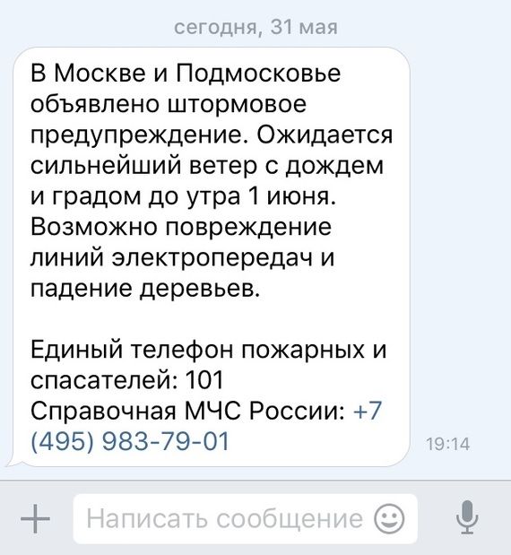 “В Москве и пригородах объявлено штормовое предупреждение. Сильный ветер с дождем и градом ожидается до утра 1 июня. Возможно повреждение электропередачи и падение деревьев”,— говорится в сообщении. В нем также указаны телефоны экстренных служб.