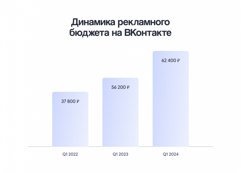 Бюджеты на продвижение во «ВКонтакте», запускаемое через «VK рекламу» и старый рекламный кабинет, также растут. В первом квартале 2024 года средние ежемесячные затраты рекламодателей на платформу составили 62,4 тыс. руб., рост за два года составил 65%.