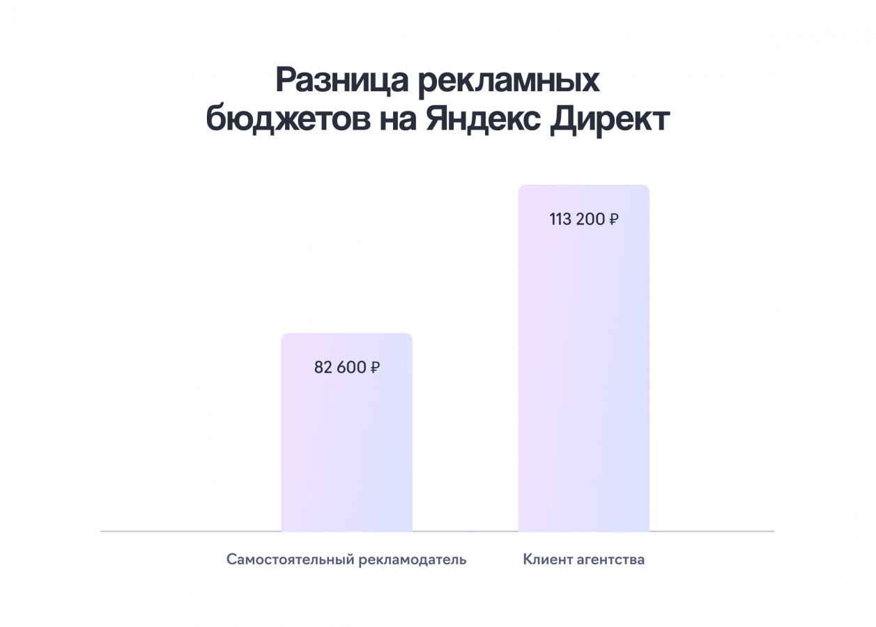 Динамика роста идентична в группах рекламодателей, работающих самостоятельно, и тех, кто привлекает подрядчиков для ведения контекстной рекламы. Но клиенты, которые ведут рекламные кампании через агентства или фрилансеров, тратят на «Яндекс Директ» на 37% больше, чем самостоятельные рекламодатели.