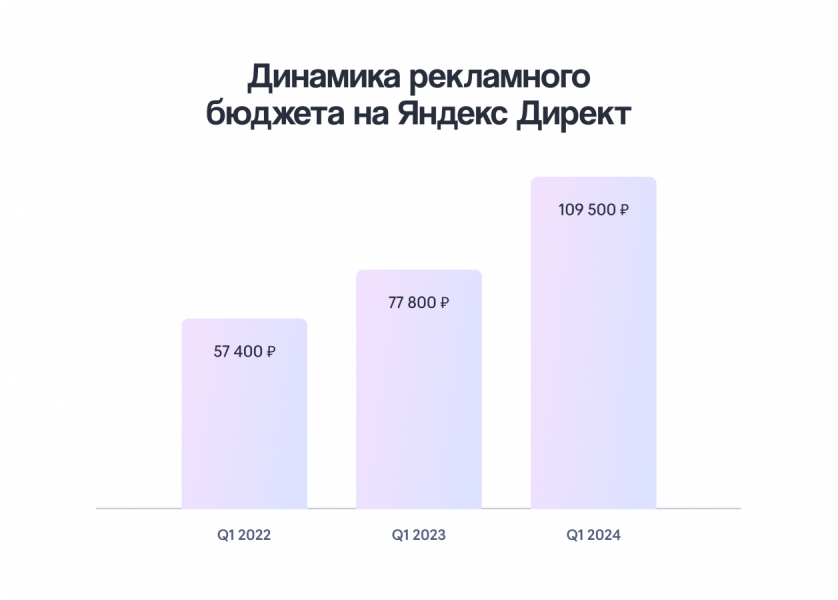 По данным eLama, cредний ежемесячный рекламный бюджет рекламодателей на «Яндекс Директ» с 2022 года увеличился более чем вдвое — с 57,4 тыс. руб. до 109,5 тыс. руб. Быстрее всего он рос во втором квартале 2022 года — на 20% по сравнению с первым, а также во втором и третьем кварталах 2023 года — 12% и 14% соответственно. К первому кварталу 2024 года он установится на уровне 109,5 тыс. руб. — это на 18% больше, чем в четвертом квартале 2023 года.