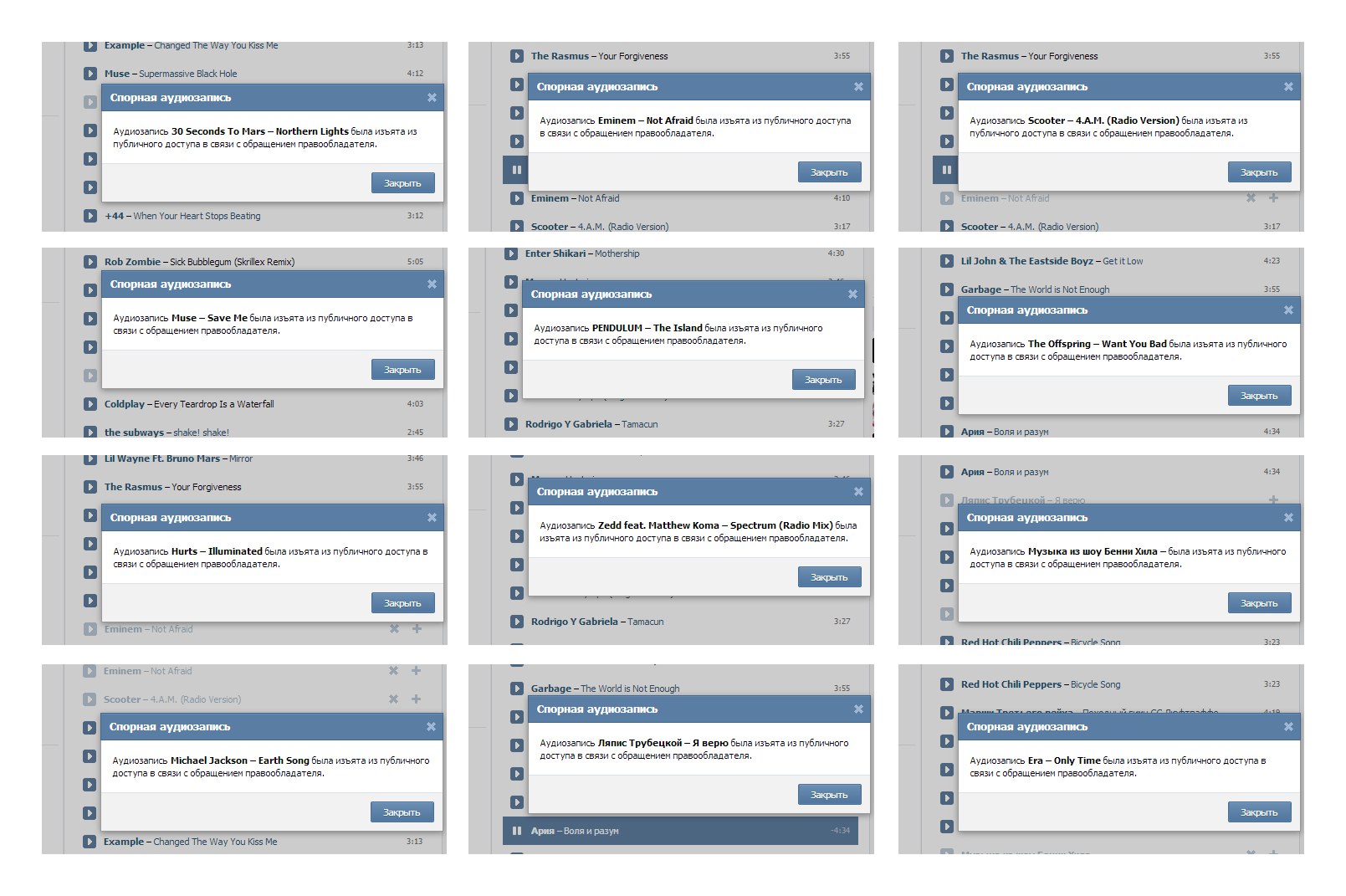 Администрация социальной сети «ВКонтакте» начала активно удалять аудиозаписи, размещенные без разрешения правообладателей. Пользователи свидетельствуют, что получают многочисленные обращения от крупных лейблов: Sony Music Entertainment, Universal Music, Warner Music. Большинство заявлений поступило от адвоката Елены Трусовой, работающей в юридической компании Goltsblat BLP.