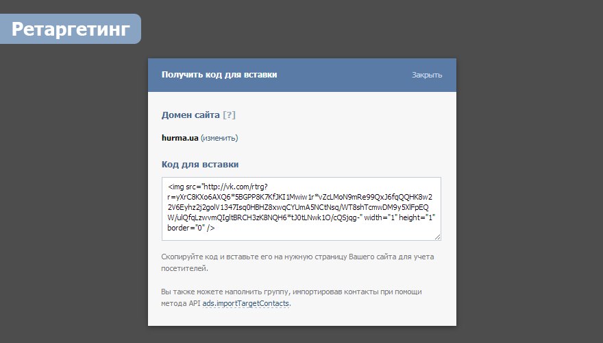 При помощи специального кода, который встраивается на страницы сайта, «ВКонтакте» собирает в группы пользователей, совершивших те или иные действия: регистрацию, подбор характеристик товара, просмотр определённых страниц. Такие группы можно использовать как один из фильтров при настройке целевой аудитории рекламного объявления. В одном рекламном кабинете можно создавать до 100 групп.